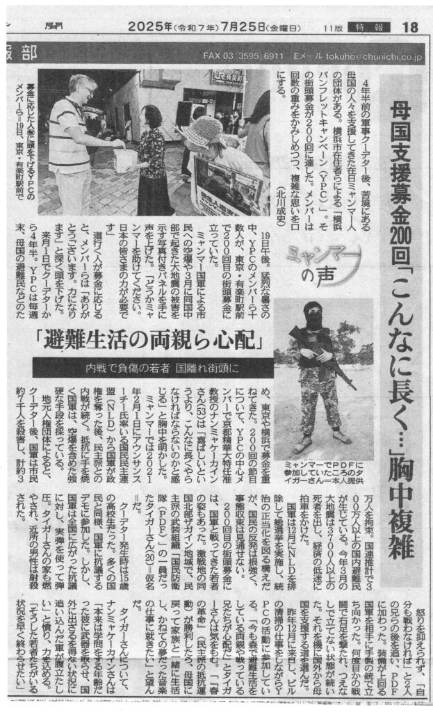 毎週土曜日に参加させて頂いているミャンマー支援募金活動が200回目に 2025年08月01日 2021年2月に起きたミャンマーでの軍事クーデター以降、毎週土曜日に参加させて頂いているミャンマー支援募金活動グループの募金活動が200回目を迎え、東京新聞に活動の様子を掲載して頂きました。 こちらのグループではこれまでにヒロスケカレーの販売もして頂き、売上げをミャンマーへの医療支援や食糧支援として役立てて頂いています。 1日も早くミャンマーが平和になりますように。 関連投稿: WEBサイトをリニューアルしました! 尾上右近さんのアンバサダー継続が決定!!! 募金活動を一緒に行ったミャンマー人留学生達のことが東京新聞の記事になりました ミャンマー仏教寺院でお布施 前の記事 一覧へ 次の記事 関連投稿: WEBサイトをリニューアルしました! 尾上右近さんのアンバサダー継続が決定!!! 募金活動を一緒に行ったミャンマー人留学生達のことが東京新聞の記事になりました ミャンマー仏教寺院でお布施